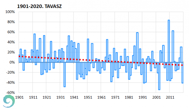2020 tavaszának csapadékösszege jelentősen elmaradt az átlagtól (–42%). Az illesztett trend 1901-től közel 18%-os csökkenést mutat (9. ábra).