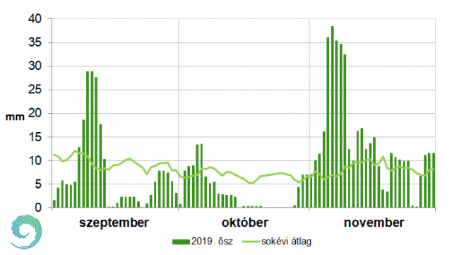 A 2019. szeptemberi csapadékösszeg országos átlagban az 1901–2019-es idősorban a medián volt, vagyis 2019 szeptembere a 60. legszárazabb és egyben 60. legcsapadékosabb szeptember volt. Az ezt követő október a 21. legszárazabb lett 1901 óta. Az évszakot végül egy nagyon csapadékos november zárta, ami a 119 éves adatsorunkban a 20. legcsapadékosabbnak adódott. (II. táblázat). A szokásosnál jóval csapadékosabb november miatt az évszak összességében az átlagosan csapadékos őszök közé került.