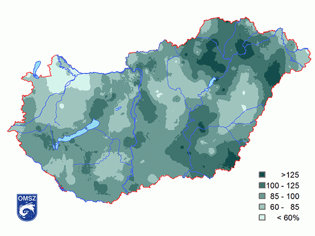 Az átlagosnál jóval csapadékosabb volt a Bükk, a Sajó mente, továbbá Tokaj környéke és a Nyírség egy része (125%-190%). Az átlagosnál szárazabb területnek adódott a Kisalföld és Győr-Moson-Sopron megye szinte teljes területe, ahol több, mint 40%-kal kevesebb csapadék hullott a nyár folyamán (7. ábra), mint általában. Máshol jellemzően a sokévi átlag közelében alakult a lehulló csapadék mennyisége.