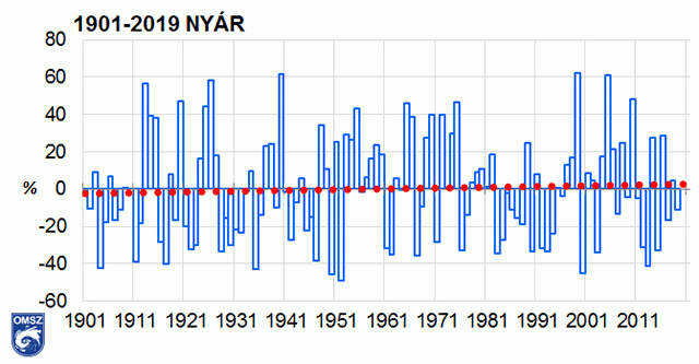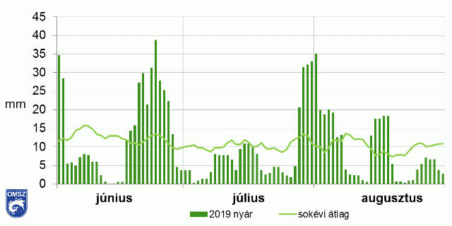 A 2019 évi nyár is a szokásosnál melegebben alakult, az évszak középhőmérséklete 22,3 °C-nak adódott, ami 2,1 °C-kal haladja meg az 1981–2010-es átlagot, ezzel 1901 óta a 2. legmelegebb nyarat hagytuk magunk mögött. A 2019-es június a legmelegebb június lett, míg az átlagosan meleg július után az augusztus a 7. helyre került a legmelegebb augusztusok rangsorában 1901 óta. Minden hónapban előfordult hőhullámos nap (25 °C feletti napi középhőmérséklet): a leghosszabb hőhullám (4 nap) június közepén volt, míg a legmelegebb időszakot 2019. augusztus 10-12 között tapasztaltuk. A háromhavi csapadékmennyiség országos átlagban 178 mm-nek adódott, mintegy 11%-kal volt kevesebb, mint az 1981-2010-es normál. Az egész évszakban gyakoriak voltak a károkozó felhőszakadások, jégesők. A legtöbb felhőszakadás június 16 és 23. között, valamint július végén, augusztus 1-jén és 13-án alakult ki. Ezen a nyáron főként a Fertő-tó környékén, illetve a Tiszántúlon hullott a legkevesebb csapadék, míg a Bükk térsége rendkívül csapadékosnak adódott.