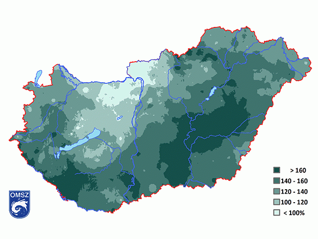 A legnagyobb területeken a sokévi csapadékmennyiség 120-160%-a hullott le hazánkban a tél folyamán. Az 1981-2010-es átlaghoz közeli csapadékot figyelhetünk meg (100-120%) a Kisalföldön és Közép-Dunántúlon. Az átlagosnál alacsonyabb értékek (<100%) Komárom-Esztergom és Nógrád megyében jelennek meg (7. ábra).