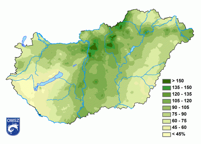 A sokévi átlaghoz viszonyított eltérések hasonló térbeli eloszlást mutatnak, mint a csapadékösszegek. Az ország nyugati és délkeleti területei szárazabbak voltak az átlagosnál, egyes helyeken a csapadék mennyisége a sokéves átlag 45%-át sem érte el (7. ábra). Az északi és a középső területeken átlagosan a normál érték 120-150%-a hullott, kis területen meghaladta a 150%-ot.