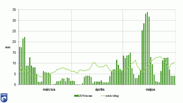 2016 tavasza a megszokottnál melegebb és szárazabb volt. Hőmérséklet szempontjából a március és az április a normálérték felett alakult. A csapadékviszonyokat tekintve az egyes hónapok változatos képet mutattak. Míg a május csapadékosabb volt a szokásosnál, addig márciusban, de leginkább áprilisban jelentős csapadékhiány mutatkozott.