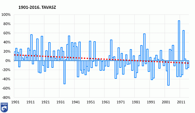 Az évszak hónapjait tekintve az áprilist emelhetjük ki, mely 107. a legcsapadékosabb (10. legszárazabb) április volt (II. táblázat). Az idei március és május nem töltött be kiemelkedő szerepet a csapadékmennyiségét tekintve, a ranglista középső részén helyezkednek el. Összességében a 2016-os tavasz a 87. legcsapadékosabb (30. legszárazabb) volt 1901 óta.