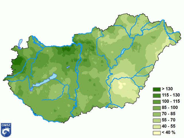 A sokévi átlaghoz viszonyított csapadékösszegek hasonló térbeli eloszlást mutatnak, mint a csapadékösszegek. Az ország keleti, délkeleti területei szárazabbak voltak az átlagosnál, egyes helyeken a csapadék mennyisége a sokéves átlag 40%-át sem érte el (7. ábra). A középső és a nyugati területeken átlagosan a normál érték 85-115%-a hullott, foltokban jelentkezett csapadéktöbblet is, mely kis területen meghaladta a 130%-ot.