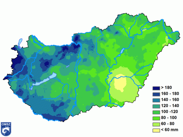 A csapadék térbeli eloszlása egy nyugat-keleti irányú csökkenést mutat (6. ábra). A Dunától nyugatra az évszakos csapadékösszeg 140-180 mm, míg az ország keleti részén 80-100 mm volt. A délkeleti megyékben hullott a legkevesebb csapadék, volt olyan terület, ahol a háromhavi csapadékösszeg nem érte el a 60 mm-t. A legnagyobb napi csapadékösszeget, 51.1 mm-t Hanságliget állomásunkon mértük.