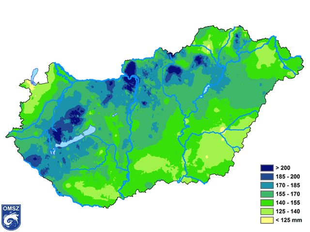 A legnagyobb területeken a megszokott csapadékmennyiség 140-170%-a hullott le hazánkban a tél folyamán. Ennél nagyobb anomáliát az ország ÉK-i területein, valamint ÉNy-on figyelhetünk meg, az átlagosnál alacsonyabb értékek pedig a Mecsek környékén és a Nyírség keleti részén jelentek meg (7. ábra).