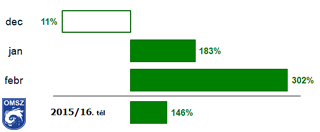 A december meglehetősen száraznak bizonyult, míg januárban és februárban jelentős többlettel számolhattunk: januárban a megszokott mennyiség 183%-a, februárban 302%-a hullott le országos átlagban (8. ábra). A december messze elmaradt a sokéves átlagtól, annak mindössze 11%-át jegyeztük. A három hónap eredményeként elmondható, hogy 2015/2016 tele 146%-kal csapadékosabbnak bizonyult a megszokottnál.