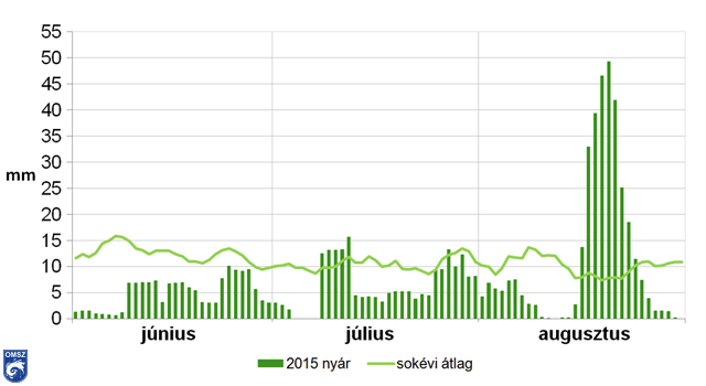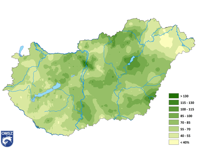A megszokott mennyiségeknél jellemzően kevesebb eső esett idén nyáron (7. ábra). Az országos átlagos csapadékösszeg hozzávetőleg 130 mm volt, ez a szokásos mennyiség mindössze kétharmada. Az egyes hónapok, jellemzően az augusztusi csapadék igen szélsőséges eloszlása az évszakos átlagok között is megmutatkozik. A Dunántúl nyugati részén jellemzően a megszokott mennyiség 40-70%-a hullott le, de ennél is nagyobb volt a csapadékhiány az ország északkeleti sarkán: itt sokszor a normál 40%-át sem érték el a jegyzett értékek. Pozitív anomália elszórtan jelentkezett, például Budapest, Gyula, a Tisza-tó és az Északi-középhegység területén, illetve Kalocsa környékén a megszokott mennyiség több mint 115%-át mértük.