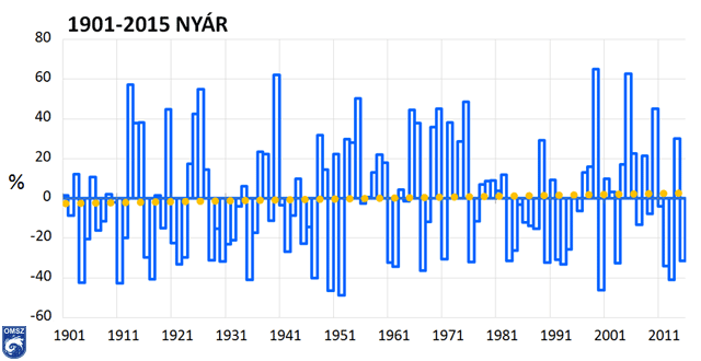 A nyári csapadékösszegek hosszú idősorát tekintve a 2015-ös nyár a szárazabbak között foglal helyet az 1901-től számított rangsorban (9. ábra).