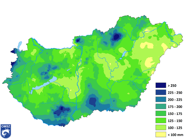 Idén tavasszal a legcsapadékosabbnak a déli határszél és a magasabban fekvő területek bizonyultak: arrafelé helyenként 200 mm-nél is több csapadék hullott a tavasz folyamán (6. ábra). Kelet felé haladva csökkenő tendencia látható. A legalacsonyabb mennyiségek a Tiszántúl északi részén figyelhetők meg, arrafelé néhol 100 mm alatti mennyiséget mértek.