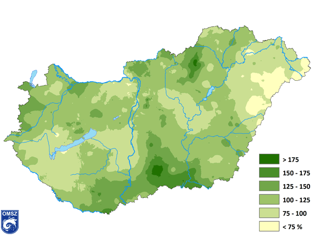 Ahogy a 8. ábrán is látható, a tavasz első hónapja különösen száraznak adódott, a regisztrált mennyiség a normál 50%-át sem érte el. Országos átlagban áprilisban a normálnak megfelelő, míg májusban azt 50%-kal meghaladó csapadék hullott hazánkban. Összességében a tavaszi időszakban a megszokott mennyiség 110%-a hullott le.