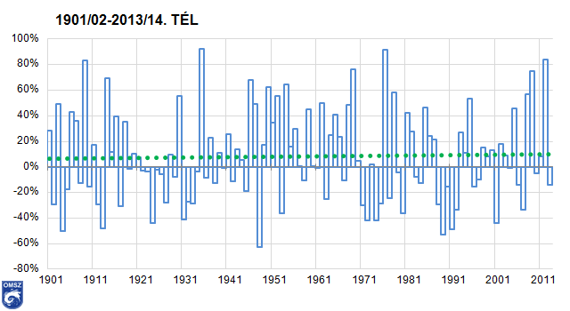 Az igen különbözően alakult csapadékösszegek az elmúlt 113 év viszonylatában is megmutatkoznak. A 2013-as december volt a múlt század eleje óta a 2. legszárazabb december (sőt, az összes hónapot figyelembe véve 1901-től mindösszesen 10 hónap zárult alacsonyabb mennyiséggel), melyet egy átlagos január követett. A téli időszakot végül egy csapadékosabb február zárta, mely a 22. legcsapadékosabb volt. Az idei tél összességében a 82. legcsapadékosabb, vagyis a 32. legszárazabb tél lett 1901 óta.