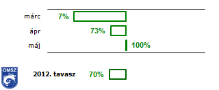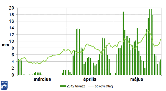 2012 tavaszán a szokásosnál magasabb hőmérsékletű hónapokat regisztráltunk, a legnagyobb eltérés márciusban volt, a legkisebb pedig májusban. Az idei március az elmúlt 112 év legszárazabb márciusa volt, az április szintén átlag alatt alakult csapadék szempontjából, míg májusban normál körüli csapadékösszeg jelentkezett országos átlagban, s így egy átlagosnál szárazabb tavaszt zártunk.