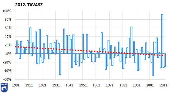 Az országos tavaszi csapadékösszegek százalékos eltérése a sokéves (1971-2000-es)átlagtól 1901 és 2012 között (interpolált adatok alapján)