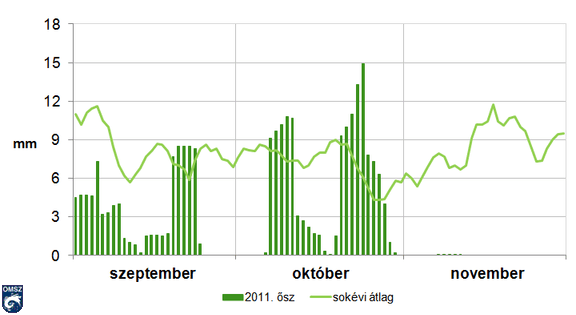 A II. táblázatban is látható, hogy az idei ősz a 110-dik legcsapadékosabb év volt az elmúlt 111 év során, vagyis a 2. legszárazabb. Ugyanakkor a legszembeszökőbb mégis a novemberi csapadékösszeg, mely a legalacsonyabb volt 1901 óta. Az eddigi rekord száraz november az 1924-es volt, amikor országos átlagban 9 mm csapadék hullott, ami még mindig tetemes mennyiségnek számít az idei novemberi 0.3 mm-es összeghez képest. A táblázatban szintén nagy sorszámmal szerepel a szeptember, mely a 99. legcsapadékosabb, azaz a 13. legszárazabb volt a hónapok sorában.