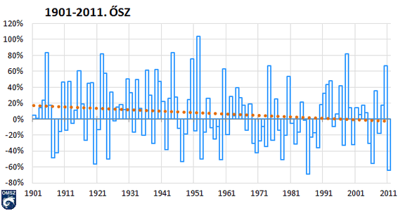 Elhelyezve az őszi csapadékösszeget az 1901-től kezdődő sorban (9. ábra), látható, hogy az átlagtól való eltérése kimagaslik a 111 év értékei közül. Ennyire alacsony csapadékmennyiség utoljára 1986-ban jelentkezett, 44 mm, ami alig kevesebb az idei 50 mm-es összegnél. Az értékekhez illesztett trendvonal az egyes években kiugróan nagy csapadékösszegek ellenére fokozatos szárazodásra utal.