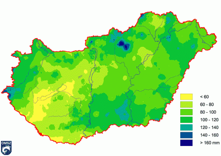 Az ország nagyobb felében 100 mm alatti csapadék hullott (6. ábra). A legszárazabb vidék a Dunántúl középső fele volt, ahol az érték kiterjedtebb régióban a 60 mm-t sem érte el. 100 mm-nél több csapadék többnyire az ország északi részében, illetve a Duna-Tisza közének déli részén hullott. A legcsapadékosabb a Mátra vidéke volt, a térképen itt 200 mm-t meghaladó érték is kirajzolódott.