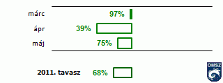 Az idei tavasz országos átlagban is szárazabbnak bizonyult, a sokévi átlag csapadékösszeg csupán 68%-a hullott le (8. ábra). Havi bontásban az április bizonyult arányaiban a legszárazabbnak, amikor a csapadék a szokásos mennyiség 40%-át sem érte el. A március ehhez képest átlagosnak bizonyult, míg májusban a sokévi átlagos hozam 25%-a hiányzott.