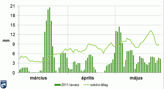 A talaj szempontjából fontos szerepet játszó, országos átlagban vett, 5 napos csapadékösszegeket mutatja a 10. ábra. Az évszak során két időszakban, március második felében és május elején fordultak elő a sokévi átlagot meghaladó értékek. Áprilisban egyetlen napon sem kerültek az összegek a szokásos mennyiség közelébe. A maximum március 20-án jelentkezett. A március 16-20. közötti ötnapos periódusban egy mediterrán ciklon átvonulásához kapcsolódóan mintegy 20.5 mm csapadék hullott országos átlagban.