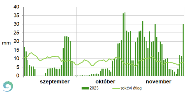 A 2023-as ősz országos átlagban vett, 5 napos csapadékösszegei és a sokévi (1991-2020-as) átlag (mm) - az adott dátumhoz tartozó érték az addig lehullott 5 napos összeget jelöli