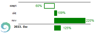 Az évszak során országos átlagban 197,7 mm csapadék hullott, ami az 1991–2020-as átlag 125%-a (8. ábra). Ez azt jelenti, hogy a megszokottnál csapadékosabb volt 2023 ősze, különösen egyenetlen időbeli eloszlással. Míg a 2022-ben a szeptember volt a megszokottnál jóval csapadékosabb, addig 2023-ban novemberben érkezett meglehetősen nagy csapadéktöbblet. Szeptemberben a normál érték 60%-a jelentkezett (35,7 mm), októberben 9%-kal hullott több a megszokottnál, novemberben az átlag kétszeresét is meghaladta a havi összeg (106,7 mm).