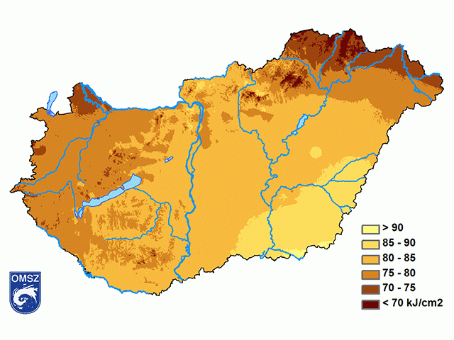 2017 őszén a globálsugárzás értékei zömmel 80 és 85 kJ/cm2 között alakultak (11. ábra). A délkeleti országrészben születtek a legmagasabb, 90 kJ/cm2-t meghaladó értékek. A legkisebb globálsugárzás értékek az ország északkeleti részén, és a Mosoni-sík területén jelentkeztek, 70-75 kJ/cm2-s értékekkel, míg az Északi-középhegység magasan fekvő részein, különösen a Mátra, Bükk és a Zempléni-hegység területén ennél alacsonyabb értékek is előfordultak.