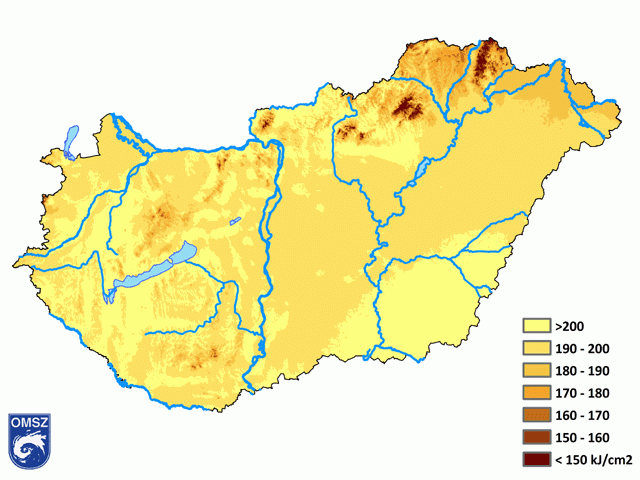 Zömmel 160-200 kJ/cm2 között alakult a nyári globálsugárzás összege hazánkban (11. ábra). Alacsonyabb értékek (150 kJ/cm2 alatt) a magasabban fekvő területeken fordultak elő. A globálsugárzás legnagyobb évszakos értékeit a Balaton nyugati medencéjében, a Dél-Alföldön és a hegységeink déli előterében detektáltuk.