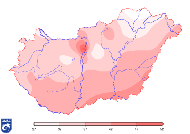 A globálsugárzás értékei 27 és 54 kJ/cm2 között alakultak. Az ország legnagyobb részén 32-37 kJ/cm2 volt jellemző. Ettől magasabb értékek a DK-i országrészben és Budapest környékén fordultak elő, alacsonyabbak pedig északkeleten.