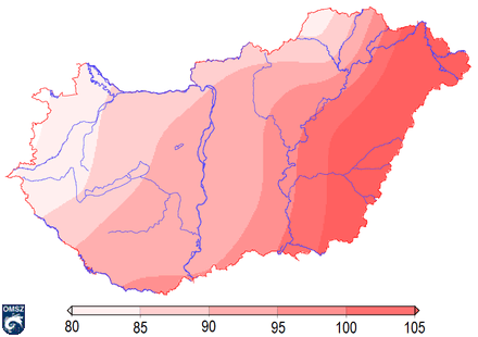 A globálsugárzás területi eloszlása jellegzetes északnyugatról délkelet felé növekvő irányt követett, az értékek többnyire 80-105 kJ/cm2 között alakultak.