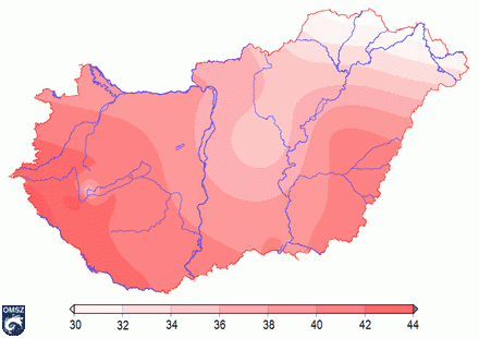 A globálsugárzás az elmúlt télen délnyugat-északkelet irányú elrendezõdést mutatott (11. ábra). A legtöbb sugárzás a Dunántúl nyugati felét érte, kisebb területen meghaladva a 44 kJ/cm2-t is. Ehhez képest az északkeleti országrészben csupán 30 kJ/cm2 körüli érték jelentkezett. Többnyire azonban a 34-40 kJ/cm2-es globálsugárzás-összeg volt jellemzõ, mely jó összhangot mutat a télen szokásos 37,7 kJ/cm2-s sokéves téli országos átlaggal.