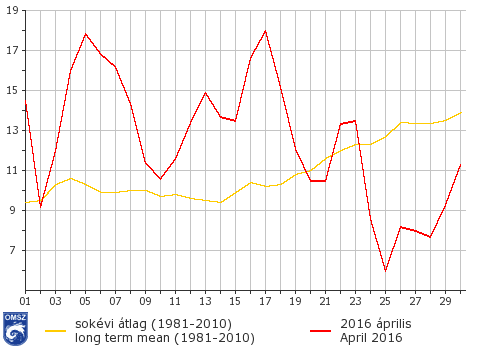 Áprilisban a napi középhőmérséklet értékek zömmel a sokéves átlag felett alakultak. Az időszak elején, Újpesten és a belvárosban 23 °C-ot mértünk, mellyel megdőlt a fővárosi melegrekord. Majd egy északnyugatról érkező hidegfront hatására hűvösebb levegő áramlott be, így az országos átlaghőmérséklet az ilyenkor szokásos érték közelébe süllyedt. Ezt követően anticiklon épült ki, amely több napig fennmaradt. Ebben az időszakban sorra dőltek meg a napi melegrekordok, 5-én új fővárosi és országos rekord született. Az eddigi legmagasabb minimumhőmérsékletet Balatonedericsen mértük 16,9 °C-kal, a II. kerületi OMSZ központban pedig 26,4 °C-ig melegedett a levegő, új fővárosi rekordot állítva. 6-án és 9-én szintén megdőltek az országos minimumhőmérsékleti rekordok; 6-án 15,7 °C-ot regisztráltunk Dunaújváros, Pécs Árpádtető és Szentlélek állomásokon, 9-én pedig Csengeren 14,5 °C-ot, mindkét esetben meghaladták az eddig mért legmagasabb értékeket. A hónap vége felé sorra érték egymást az időjárási frontok, melynek hatására több napon keresztül az átlagosnál jóval alacsonyabb hőmérsékleti értékek jelentkeztek. 21-én főként a Dunától keletre mértünk fagypont alatti hőmérsékleti értékeket, 26-án pedig a Dunántúlon pusztított a fagy. 25-én 2 cm friss hó hullott a Kékestetőn. 28-án új fővárosi minimumhőmérsékleti rekord született, ekkor -0,7 °C-ig hűlt le a levegő a János-hegyen.