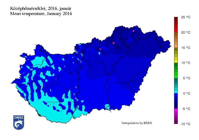 A januári átlaghőmérséklet -3 és 1°C között alakult hazánk nagy részén. Ennél hidegebb az Északi-középhegység magasabban fekvő területein voltak (-4 – - 6°C). Fagypont feletti hőmérséklet értékeket leginkább a Dunántúl déli részén, valamint a Kisalföld egyes régióiban mértünk. Az országos havi átlaghőmérséklet térképen megfigyelhető egy DNy-ÉK irányú hőmérséklet csökkenés.