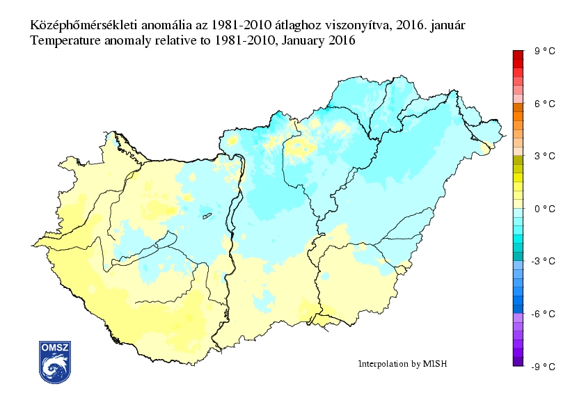 Országos átlagban a havi középhőmérséklet (-1,0°C) hasonlóan alakult, mint az 1981-2010-es sokévi átlag (-0,9°C). Az ország nagy részén -0,5 – +0,5°C közötti anomália jelentkezett, ennél alacsonyabb értékek az ország északkeleti felén tűntek fel. A legnagyobb pozitív anomáliák a Mátra nagy részére és az ország déli, délnyugati területeire voltak jellemzőek, 1-1,5°C-kal volt melegebb az ilyenkor megszokottnál.