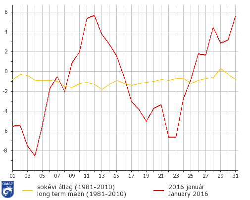 A 2016. januári országos középhőmérséklet havi menete változatos képet mutat. A hónap elején anticiklon épült ki Magyarország felett, melynek köszönhetően a szokásosnál jóval alacsonyabb hőmérsékleti értékeket mértünk. Január 9-től szinte napi gyakorisággal vonultak át különböző frontrendszerek, így az átlagnál melegebb volt. A legmagasabb hőmérsékleti értéket 11-én, Hajóson regisztráltuk (16,8 °C). A hónap közepétől ismét anticiklon határozta meg hazánk időjárását. Ebben az időszakban, 23-án mértük a legalacsonyabb napi átlaghőmérsékletet, -18,5°C-ot Mihálygergén. A hónap végén melegedni kezdett az idő és január 25-től ismét a megszokottnál melegebb volt.