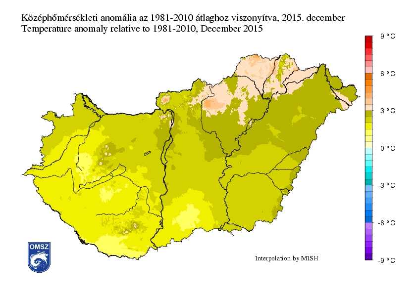 Decemberben az ország túlnyomó részén 2-3°C-os középhőmérsékletet mértünk. Egyes területeken az átlaghőmérséklet megközelítette az 4°C-ot. Hűvösebb körzetek az Északi-középhegység legmagasabb pontjain voltak, főként a Bükkben és a Zempléni-hegységben. A térképen is jól látható, hogy ezeken a területeken a havi középhőmérséklet 0°C alatt alakult.