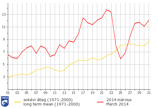 2014 márciusa jelentősen melegebbnek bizonyult a megszokottnál: az országban sehol sem volt hűvösebb a harmincéves átlagnál, a legnagyobb részen a havi átlaghőmérséklet a sokéves normálnál 3,5-4,5 °C-kal is magasabbnak adódott. Az ÉK-i régióban és a Dunántúli-középhegységben alakult ki a legnagyobb pozitív anomália, itt átlagban 4,5-5,5 °C-kal is melegebb volt a szokásosnál.