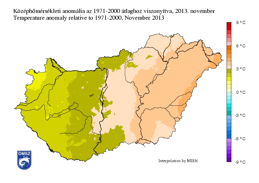 Országszerte melegebb volt a sokéves átlagnál, az anomália térképen nyugatról keletre növekvő értékeket látunk. Még az ország északkeleti csücskében jelentkező legkisebb eltérés is +1,5°C-nak adódott, a keleti határszélnél pedig meghaladta a 4°C-ot is.