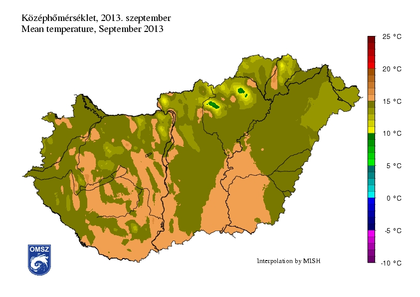 A szeptemberi középhőmérséklet 14-16°C között alakult hazánk legnagyobb részén, alacsonyabb hőmérsékletek csak magasabb hegységeinkben, valamint az északkeleti határszélen jelentkeztek. A Bükk és a Mátra legmagasabb pontjain 10°C alatti értékek adódtak.
