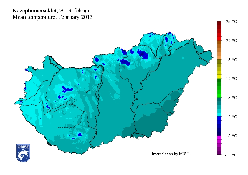 A középhőmérséklet februárban ÉNY – DK irányú növekedést mutatott. Az ország túlnyomó részén 1-3°C közötti havi értékek jelentkeztek. A DK-i országrészben volt a legmelegebb, a legmagasabb havi átlagértéket is itt regisztráltuk (Szeged belterület, 3,7°C). Ennél hidegebb a magasabban fekvő területeken volt jellemző: a legalacsonyabb februári középhőmérsékletet Kékestetőn jegyeztük -2,9°C-kal.