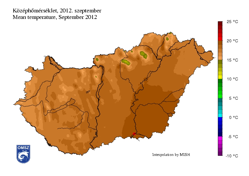 Az ország túlnyomó részén 17-19 °C-os középhőmérsékletet mértünk szeptemberben. Az Alföld délkeleti részén azonban, igen nagy területen 19-20 °C közötti értékek jelentkeztek, sőt Szeged környezetében 20 °C feletti havi középhőmérsékletet regisztráltunk, vagyis ezeken a területeken nyári meleg volt tapasztalható. Hűvösebb területek a nyugati határszélen és magasabb hegységeinkben jelentkeztek (15-17 °C), az Északi középhegység legmagasabb pontjain 12-13 °C alatti értékeket is láthatunk térképünkön.
