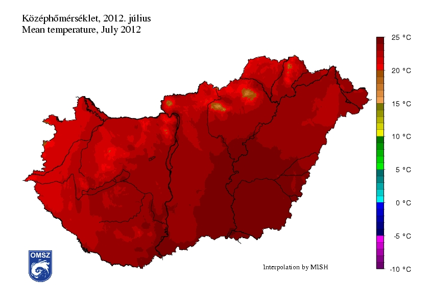 Az idei július a sokéves átlagnál melegebbnek bizonyult, országszerte az átlagnál legkevesebb 1,3 °C-kal mindenhol magasabb átlaghőmérsékletek voltak jellemzőek. A harmincéves átlagot leginkább meghaladó középhőmérsékletű területek az ország D-DK-i részein figyelhetők meg, itt akár 4 °C-kal is melegebb volt a megszokottnál.