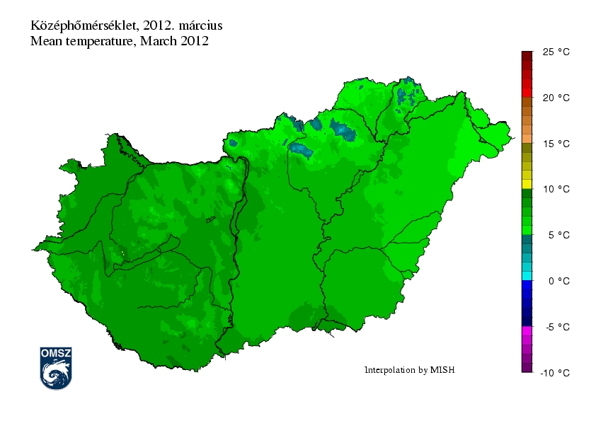 A hónap nagyobb részében átlag feletti hőmérséklet volt jellemző, csupán a 4-10-e közötti időszakban alakult a normál alatt a napi középhőmérséklet országos átlagban. A leghidegebb nap (március 7.) ebben az időszakban volt, amikor is -1,8 °C-os középhőmérsékletet mértünk, mely 5 °C-kal maradt el az átlagtól; valamint ezen a napon észleltük a hónap legalacsonyabb hőmérsékletét is (-14,1 °C, Zabar). 10-e után kisebb-nagyobb ingadozásokat figyelhettünk meg a napi középhőmérséklet alakulásában, de végig a normál felett maradtak az értékek. A legmagasabb napi átlaghőmérsékleteket (13 °C feletti átlaghőmérsékletet) 18-án és 25-én mértük.