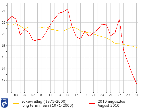 A hónap első napjaiban a szokásosnál melegebb volt, de a 2-án kezdődött lassú lehűlés következtében a napi középhőmérséklet országos átlaga 4-én már a sokévi átlag alá csökkent. Augusztus 11. után ismét a szokásosnál melegebb volt; a meleg periódus kisebb megszakítással 28-ig tartott. A hónap utolsó napjaiban azonban jelentősen visszaesett a hőmérséklet, 31-én országos átlagban már mintegy 6 fokkal volt hidegebb, mint a sokévi átlag.