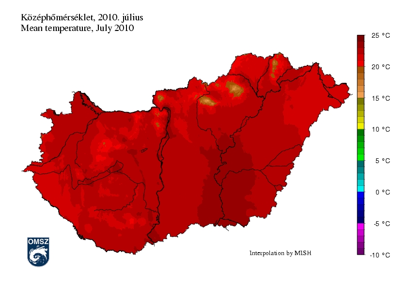 Júliusban a havi középhőmérséklet általában 21 és 24 fok között alakult, mindössze középhegységeink magasabb térségeiben volt ennél hűvösebb. Ezeken a helyeken a havi középhőmérséklet a 20 fokot sem érte el. A magasabb hőmérsékleteket leginkább az Alsó-Tisza-vidéken élők érzékelhették.