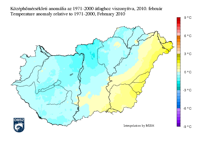 A havi középhőmérséklet sokéves átlagtól való eltérése szintén északnyugat-délkelet irányú övezetességet mutatott. Az értékek a Cserhátban maradtak leginkább az 1971-2000-es normál alatt, helyenként ez a különbség abszolút értékben az 1,5 °C-ot is meghaladta. A legnagyobb, kisebb területeken a 2 fokot megközelítő pozitív anomáliák az ország északkeleti csücskében jelentek meg.