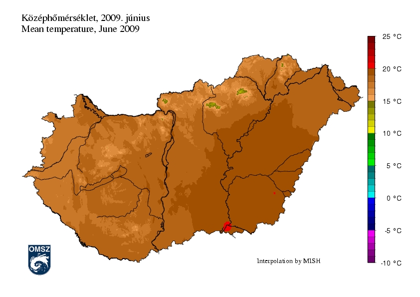 Június során a napi országos középhőmérsékletek főként a hónap első öt napján illetve 20-tól kezdődően a sokévi átlagértékek alatt maradtak.