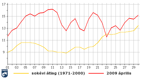 Az idei áprilisban nem volt jellemző az intenzív melegedési görbe. Már a hónap elején nagyon meleg volt, a középhőmérséklet jelentősen meghaladta a sokévi átlagot. Kisebb ingadozásokkal ez a meleg maradt meg a hónap végéig. Jelentős lehűlés 23-án volt érezhető, ezen a napon az átlagosnál hűvösebb volt. A hónap többi napján pozitív voltaz anomália, bár a hónap végén mértéke csökkent.