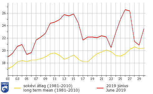 Az OMSZ megfigyelő hálózatában működő mérőállomások adatai szerint a hónap minden napján magasabb hőmérséklet uralkodott, mint az 1981-2010-es sokévi átlag. A hónap elején egy magassági hidegörvény miatt még 20 °C közelében alakult országosan a napi átlaghőmérséklet. Június 1-én Zabaron mindössze 5,8 °C volt a minimum. Később egy nagykiterjedésű anticiklon hatására gyorsult a felmelegedés és a napi középhőmérséklet több napon keresztül meghaladta a 25 °C-ot. A Balaton vizének hőmérséklete az első dekád végére már 20°C fölé emelkedett. Az első hőhullám idejére (2019. június 12-én (szerda) 00:00 órától 2019. június 16-án (vasárnap) 24.00 óráig) az országos tisztifőorvos III. fokú hőségriasztást adott ki. Június 15-én Budakalászon (35,8 °C), míg június 16-án Kiskunhalason (35,7 °C) dőlt meg a napi országos csúcshőmérséklet korábbi legmagasabb értéke. Az első hőhullámnak egy hullámzó frontálzóna vetett véget. Ezt követően a második dekád végéig nedves, labilis levegő határozta meg időjárásunkat. Az utolsó dekádban uralomra jutó anticiklon egy rövid, de intenzív hőhullámot okozott: június 25-27 között 26 °C-ot meghaladó átlaghőmérsékletű napok is előfordultak, és országos átlagban 6-7 fokkal volt melegebb a szokásosnál. Júniusban a hőmérséklet legmagasabb értékét június 27-én Zagyvarékas (36,4 °C) állomáson rögzítettük. Nem sokkal ezután egy észak felől érkező hidegfront miatt hirtelen lehűlés zajlott. A hónap végén alapvetően napos, nyári idő volt. A rekord meleg időjárás főként a nyári napok számában látszik: az országban átlagosan 27 nap volt nyári nap (Tmax ≥ 25 °C) és 11 nap adódott hőségnapnak (Tmax ≥ 30 °C). Mind a nyári, mind a hőségnapok száma (rendre 11 és 7 nappal) több, mint az 1981-2010 közötti normálérték. 2019 júniusában forró nap (Tmax ≥ 35 °C) csak néhány állomáson fordult elő.