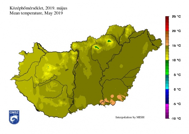 A májusi havi középhőmérséklet jócskán elmaradt a szokásostól. Az ország nagy részén jellemzően 16°C körül alakul a havi középérték, idén viszont sehol nem érte el a májusi átlag a 16°C-ot, még a 15°C-ot is csak néhol haladta meg délkeleten, illetve Budapest belvárosában, összesen 6 állomáson, azokon is csupán 1-2 tizedfokkal. Nyugat felé haladva egyre hűvösebb volt a hónap. A Dunától keletre, az Alföldön még 14–15°C, a Dunántúl keleti, délkeleti részén már csak 13–14°C, a Nyugat-Dunántúlon, a Kisalföldön viszont mindössze 12–13°C közötti középhőmérsékletű volt a 2019-es május. A magasabb hegyeken még a 10°C-ot sem érte el a hónap középhőmérséklete, a leghidegebb a Kékesen volt (8,3°C). A hegyi állomásokon kívül (400 m alatt) Szentgotthárd Farkasfán lett a leghűvösebb a május (12,1°C).